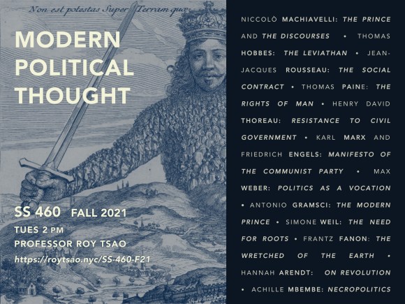 This course is an introductory/intermediate course in political theory (despite the 400-level course number). Students from all Pratt programs are welcome, whatever their prior coursework or familiarity with the subject-matter. The course is also counted as an elective within the Philosophy minor.